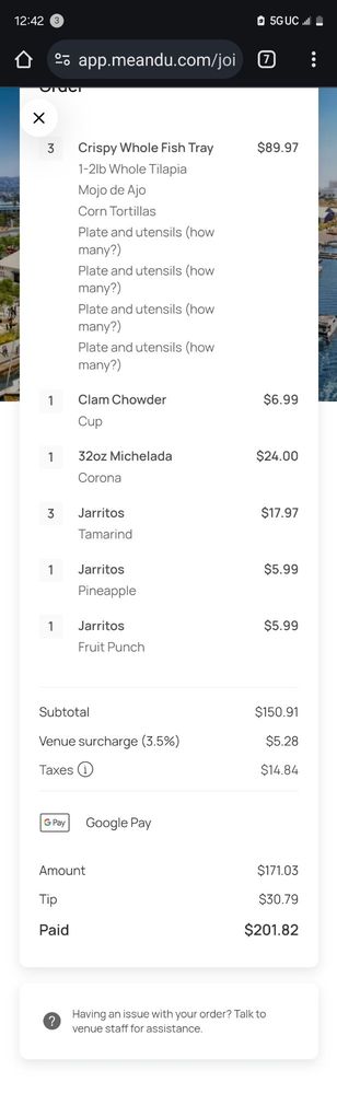 Whitefish, avocado, cucumber, cilantro, serranos, onion & pineapple in citrus marinade with tostada